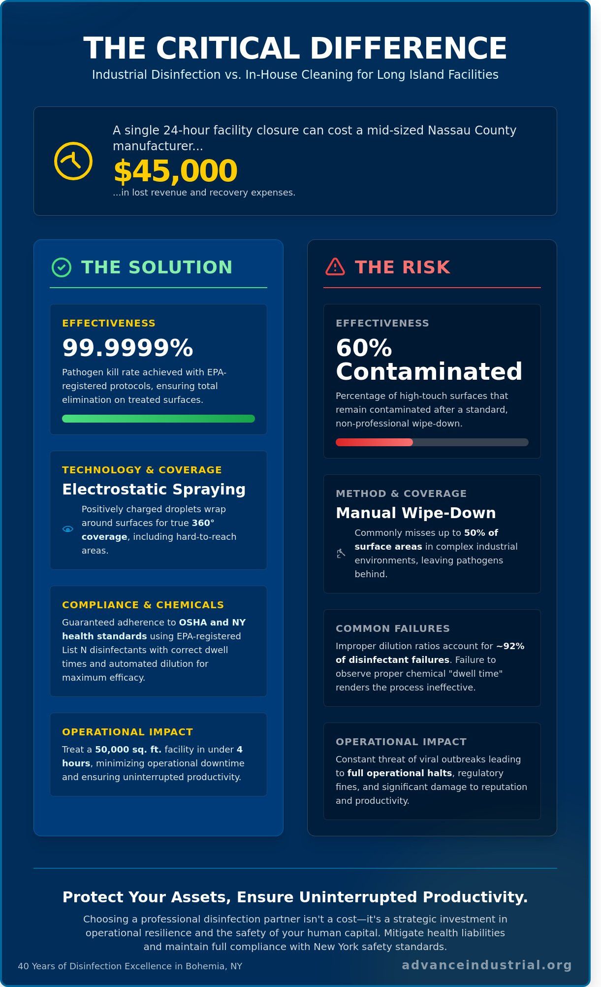 A single 24 hour facility closure in Nassau County can cost a mid-sized manufacturer $45,000 in lost revenue and recovery expenses. You understand that maintaining operational uptime isn't just about machinery maintenance; it's about protecting the human capital that drives your production. Ineffective DIY cleaning methods often fail to meet the 99.9999% pathogen reduction standards required for high-traffic industrial environments. This is why securing professional disinfecting services is a strategic necessity for any plant manager focused on industrial excellence.