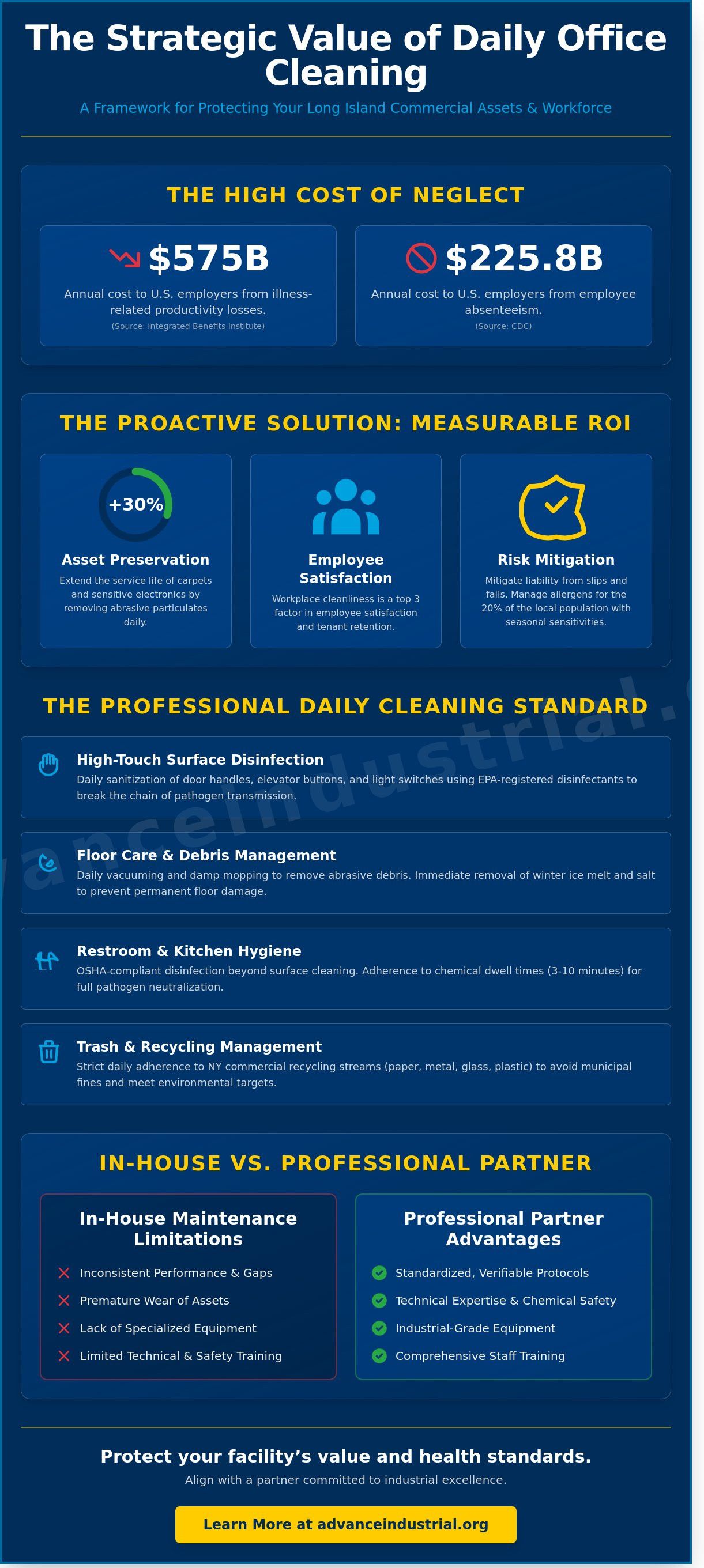 Maintaining a high-performing workplace requires a rigorous commitment to daily office cleaning protocols that protect both employee health and physical assets. By implementing standardized checklists and prioritizing high-stakes environments like medical suites, Long Island firms ensure their operations remain uninterrupted. Advance Industrial Maintenance brings over 40 years of experience to Nassau and Suffolk Counties, providing the technical authority needed to manage complex facility requirements. Our solution-oriented team focuses on industrial excellence and operational uptime, treating every service agreement as a strategic partnership. We understand the specific demands of the 2026 business landscape. Whether you manage a general corporate office or a sensitive healthcare facility, professional consistency is your greatest defense against operational friction. It's time to transition from reactive maintenance to an engineered strategy that supports your long-term success. We've seen every industrial challenge and possess the insight to solve them. We're ready to help you maintain a facility that works as hard as you do.