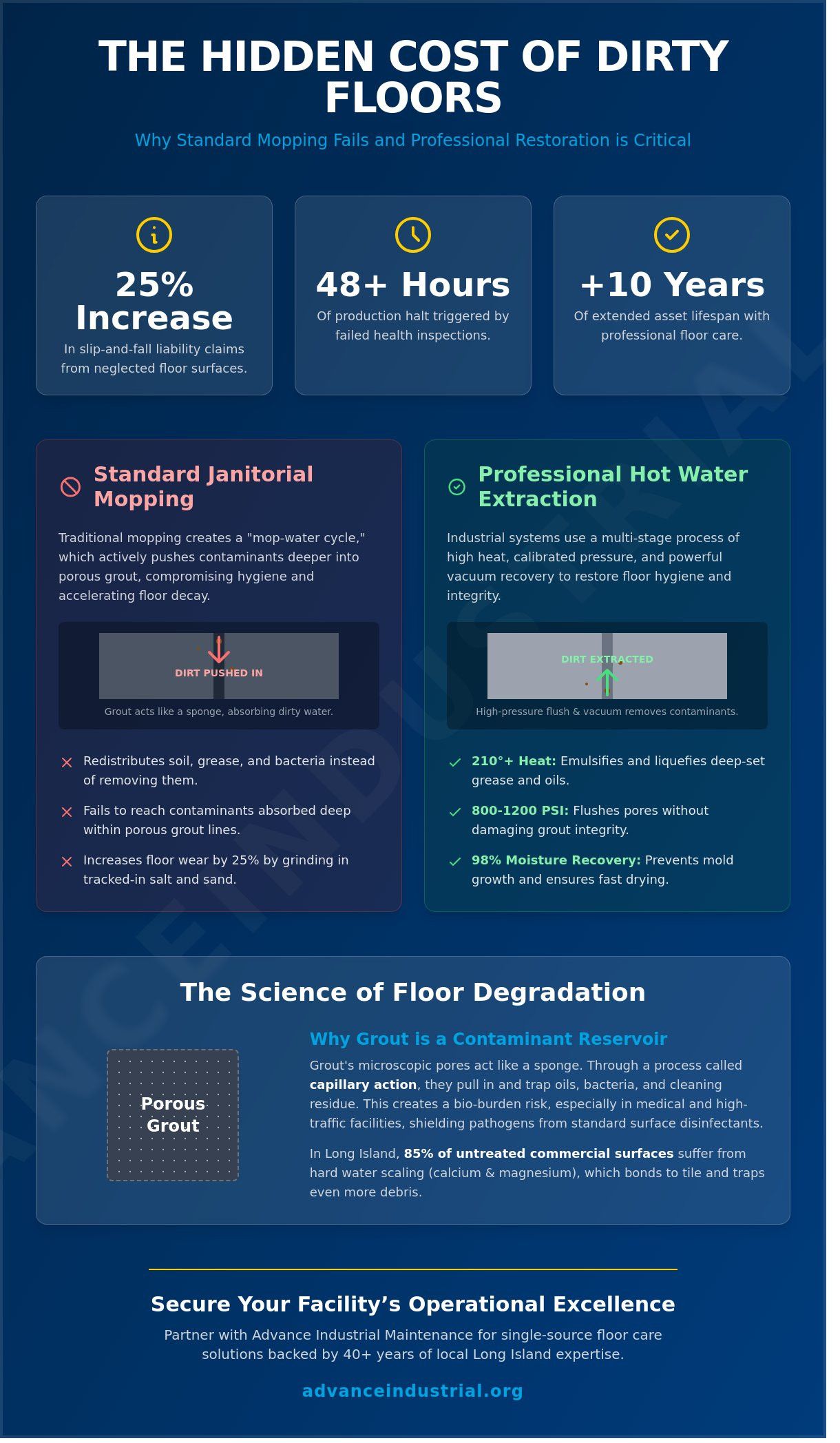At Advance Industrial Maintenance, we understand that Long Island procurement professionals and plant managers require reliable, engineered solutions to protect their industrial infrastructure. This guide outlines how technical restoration protects your facility's equity while ensuring a hygienic environment for both staff and visitors. We'll examine the specific methodologies used to restore floor aesthetics, extend asset lifespan, and simplify your daily maintenance routines through strategic industrial partnerships that prioritize your operational continuity.