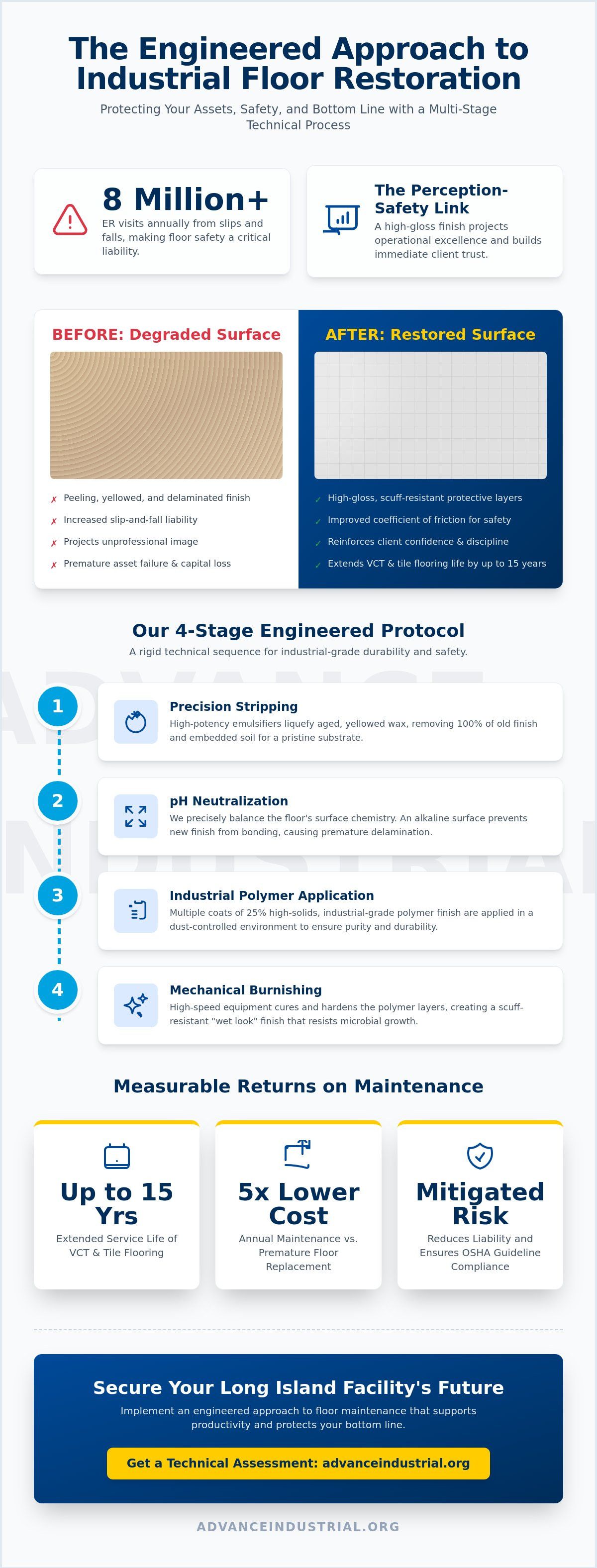 The cost of annual maintenance is significantly lower than the capital expenditure required for new flooring. Replacing VCT can cost five times more than a scheduled stripping and waxing program. Advance Industrial acts as a strategic partner in facility lifecycle management by extending the life of existing assets. This pragmatic approach prevents the 30% premature floor failure rate commonly seen in neglected industrial environments, ensuring uninterrupted productivity for the long term.