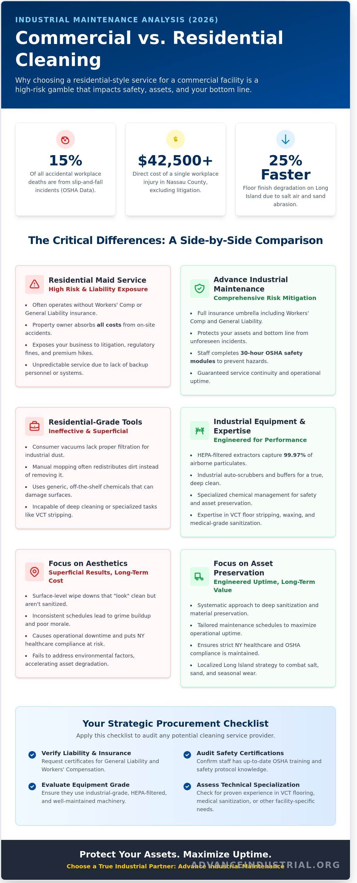 Choosing a residential maid service for your 10,000-square-foot Bohemia facility might look like a budget-friendly decision, but it often results in the highest long-term costs a plant manager can face. You've likely seen how inconsistent maintenance schedules lead to more than just dusty desks. Neglected surfaces directly impact employee morale and operational uptime. When floor safety is overlooked, the stakes rise; slip-and-fall incidents represent 15% of all accidental deaths in the workplace according to OSHA data. Relying on sub-par professional cleaning services puts both your personnel and your bottom line at risk.