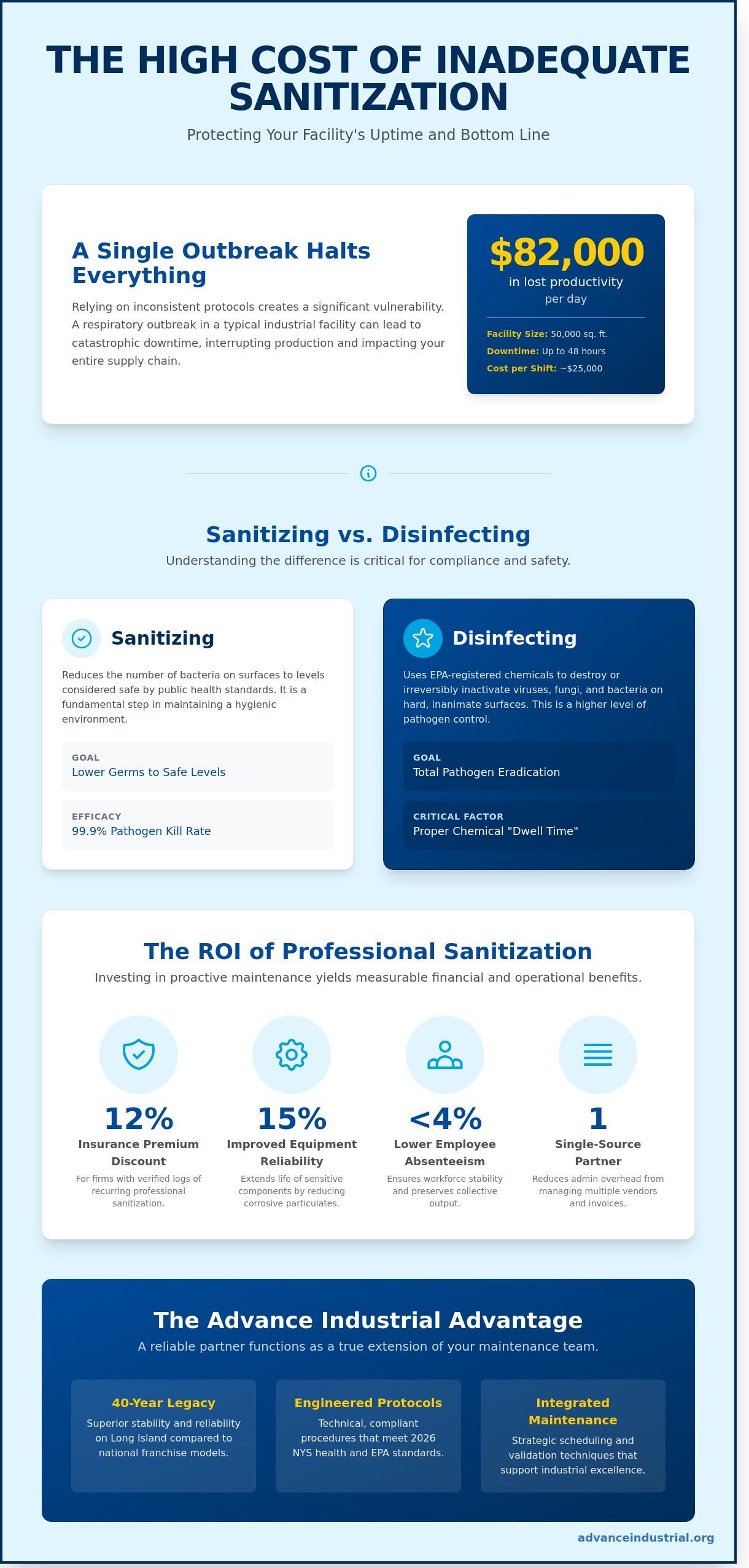A single respiratory outbreak can halt production in a 50,000-square-foot facility for up to 48 hours, costing an average of $25,000 per shift in lost output. You recognize that maintaining operational uptime requires more than a surface-level wipe down. Procurement managers in high-traffic hubs like Melville and Hauppauge often face confusion when distinguishing between basic cleaning and professional commercial sanitizing services that actually mitigate liability and meet 2026 compliance standards. Relying on inconsistent protocols creates a vulnerability that your bottom line can't afford.