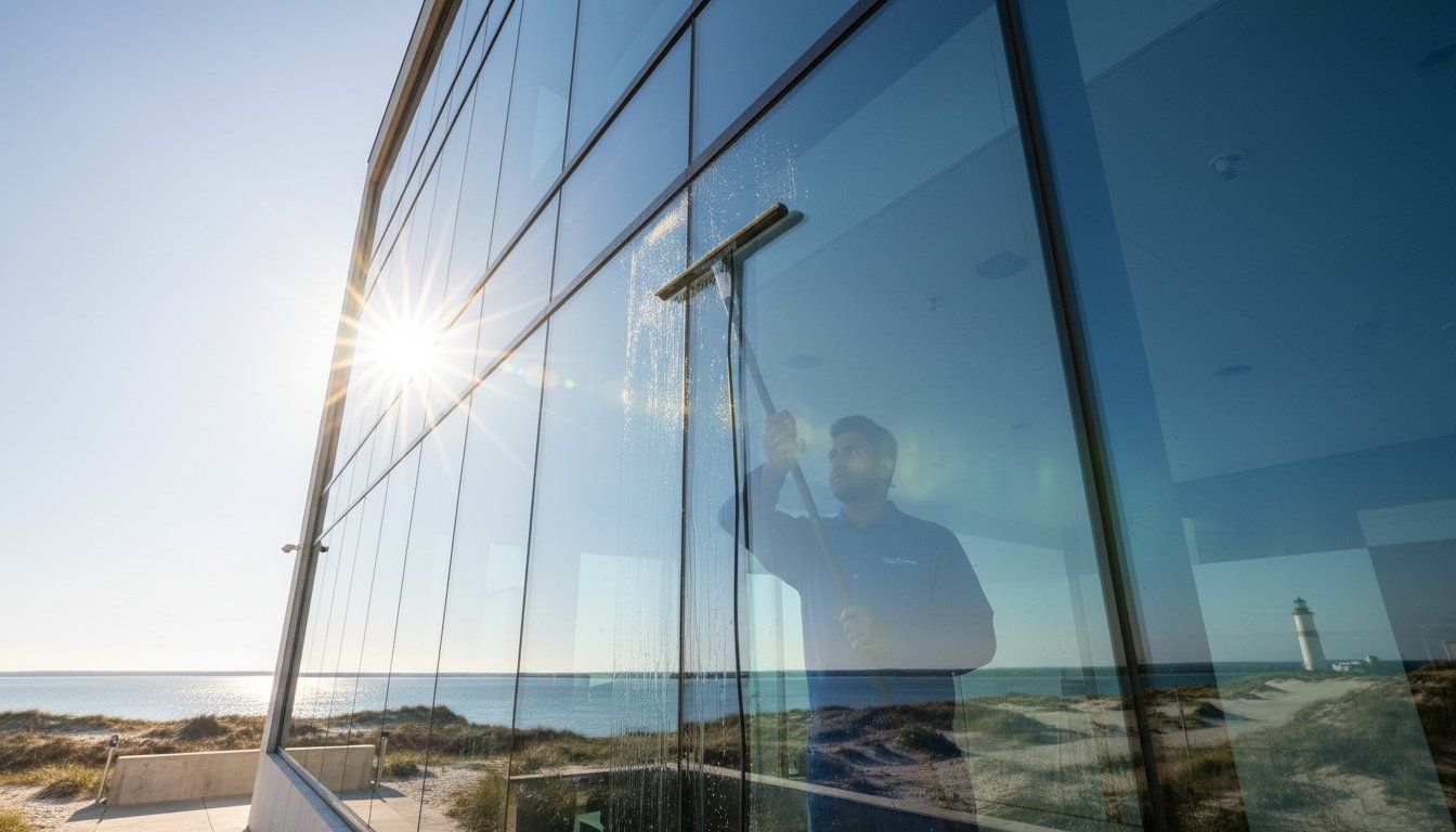 Salt crystals create a hygroscopic layer on glass that attracts moisture and accelerates mineral etching. If salt stays on the surface, it bonds chemically with the silica, leading to permanent cloudiness. Our "Double-Rinse" eco-method neutralizes this risk without acidic chemicals. We first use a high-volume rinse to clear loose particulates. We then follow with professional-grade deionized water. Since this water lacks mineral ions, it aggressively attracts contaminants and dries without streaks, even in high-humidity coastal air. This engineered approach maintains structural integrity and glass clarity near the shoreline.
