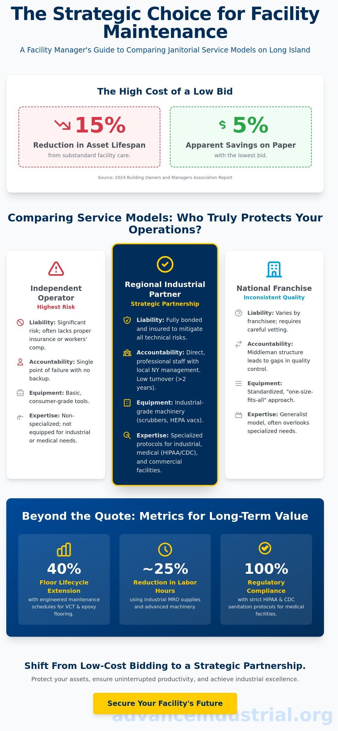 The lowest bid on a maintenance contract often creates the highest operational burden for Long Island facility managers. While a 5% savings on paper looks efficient, a 2024 Building Owners and Managers Association report indicates that substandard facility care can reduce asset lifespan by up to 15%. A rigorous janitorial services comparison is no longer about finding the cheapest labor; it's about securing a strategic partnership that protects your infrastructure and ensures uninterrupted productivity.
